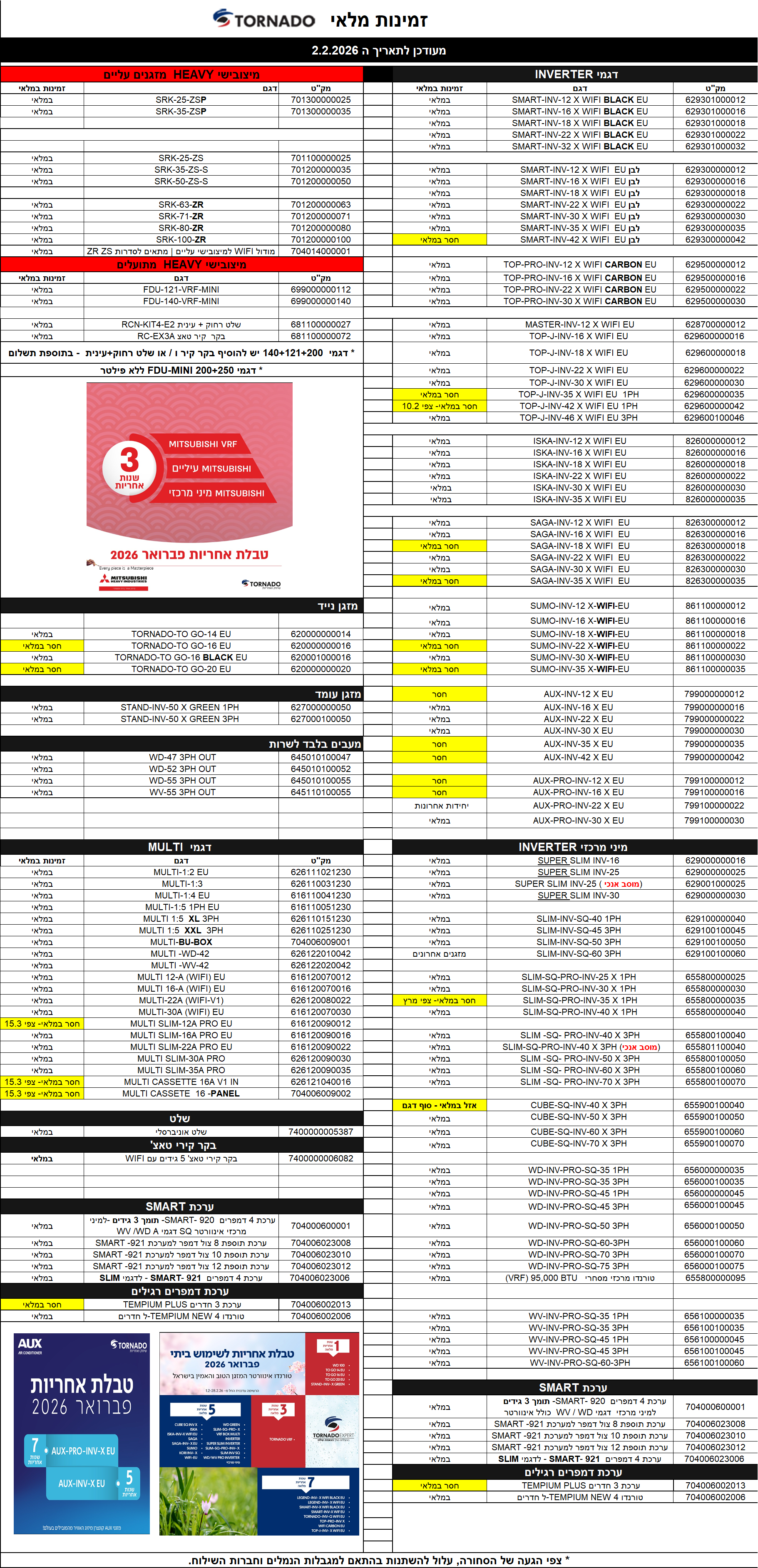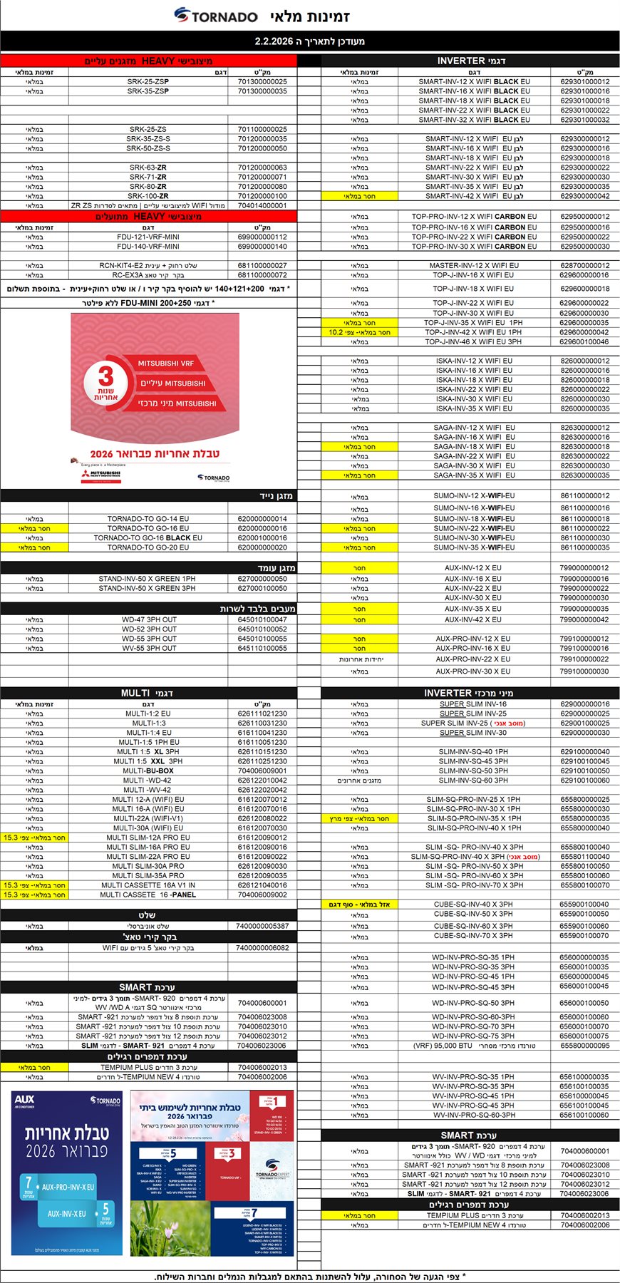אישור זמינות דגם המזגן יקבע רק לאחר קבלת הזמנת הרכש.