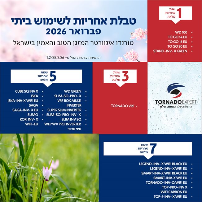 אנו מעניקים אחריות מורחבת למזגני טורנדו, מומלץ לדווח על רכישת המוצר באתר בכדי למנוע עיכוב.