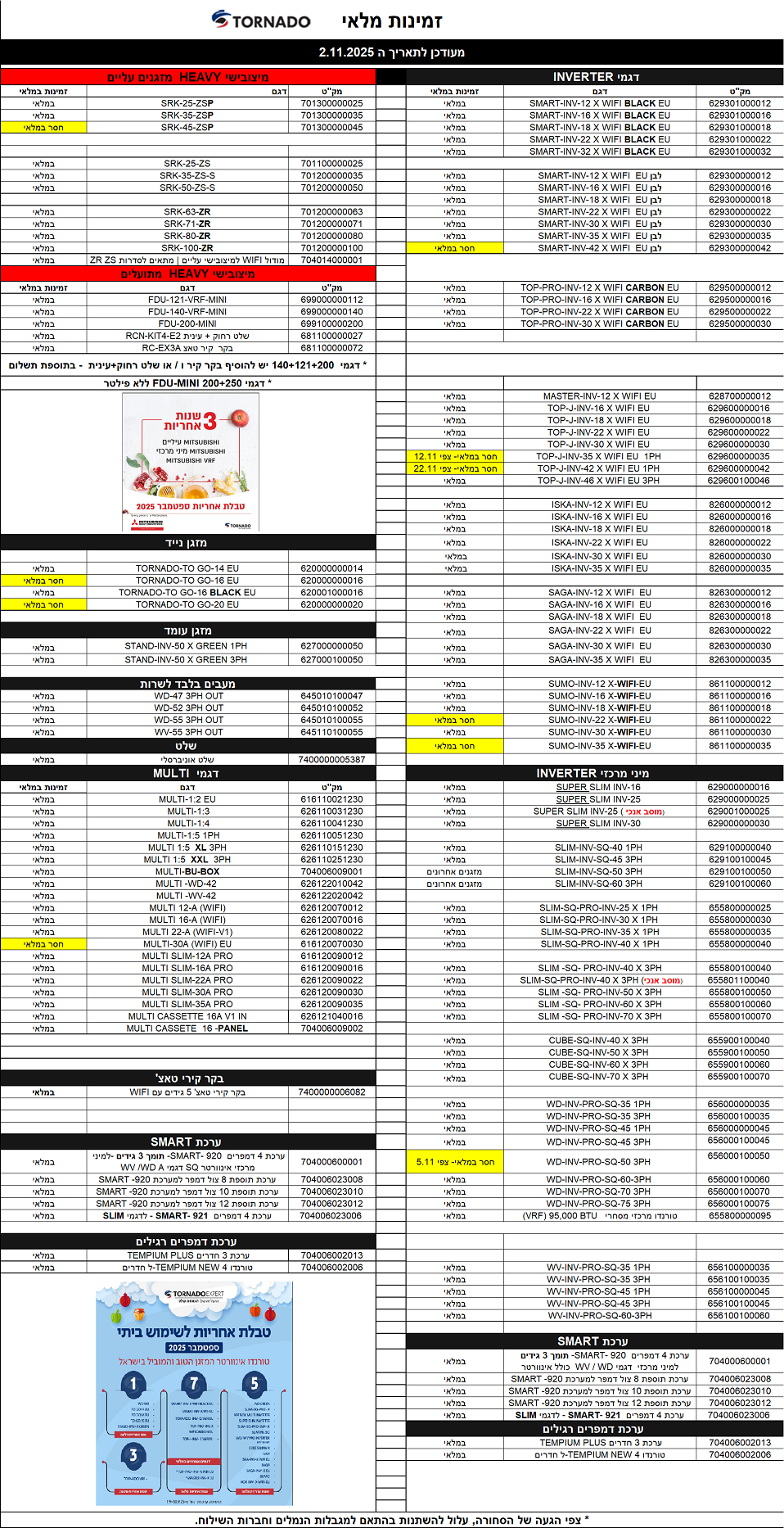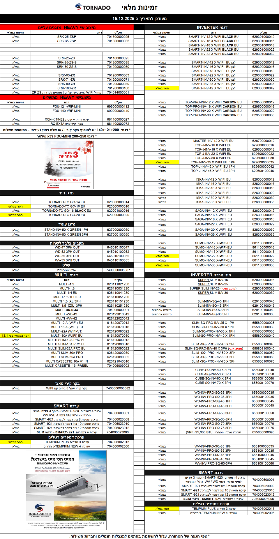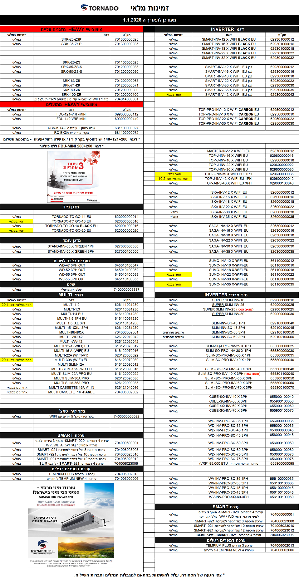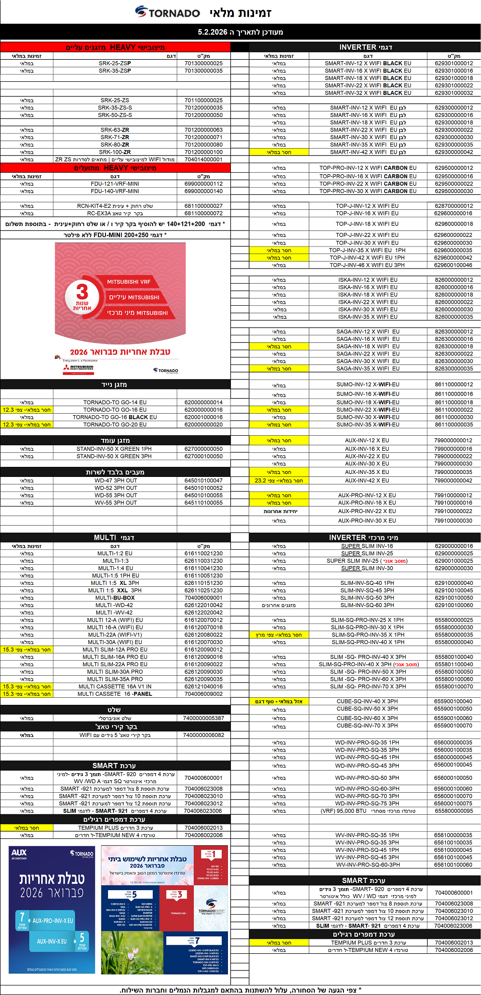אישור זמינות דגם המזגן יקבע רק לאחר קבלת הזמנת הרכש.